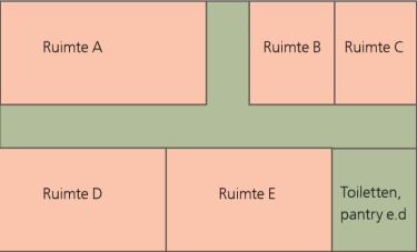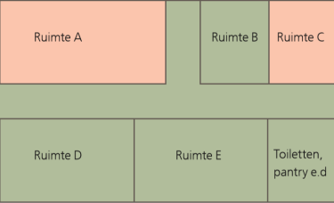 Figuur 1: Asset met meerdere huurders , waarbij de gemeenschappelijke ruimtes en ruimtes B, D en E worden meegenomen in het assessment (in groen weergegeven).