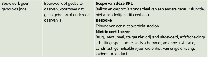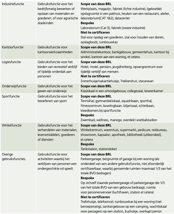 BREEAM-NL stelt binnen de verschillende onderwerpen specifieke eisen aan de bij het gebouwtype behorende hoofdgebruiksfunctie. Volgens het Bouwbesluit is de gebouwfunctie de functie die aan een gebouw of ruimte in een gebouw is toegekend. De gebouwfunctie betreft ‘de gedeelten van één of meer bouwwerken op een perceel of standplaats, die dezelfde gebruiksbestemming hebben en die tezamen een gebruikseenheid vormen’. De meeste toepassingen van bovengenoemde gebruiksfuncties kun je met deze beoordelingsrichtlijn certificeren, maar niet alle. Bekijk tabel 2 voor een overzicht.