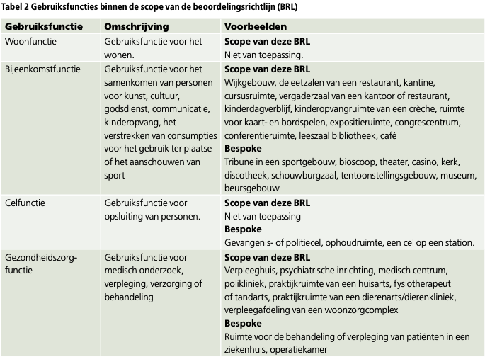 Deze beoordelingsrichtlijn kun je momenteel gebruiken voor de beoordeling van onderstaande gebruiksfuncties van een gebouw: