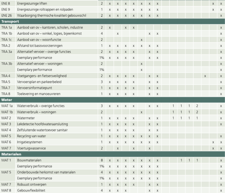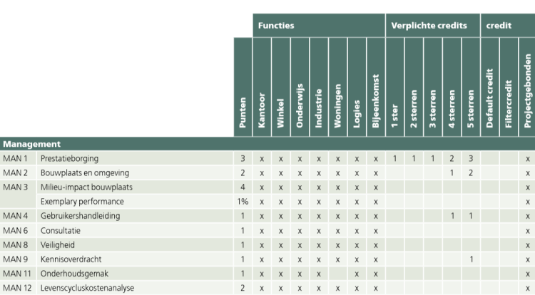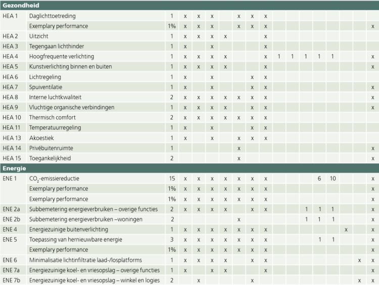 De lijst met credits waarop een gebouw beoordeeld wordt, is afhankelijk van het te beoordelen gebouwtype en bepaalde toegepaste gebouwcomponenten, zoals liften, roltrappen of een koel-/vriesopslag voor warenkoeling. Bij het invoeren van de gebouwgegevens in de assessmenttool wordt automatisch de benodigde creditlijst gegenereerd. Zie de Tabel Bijzonderheden credits voor een overzicht.